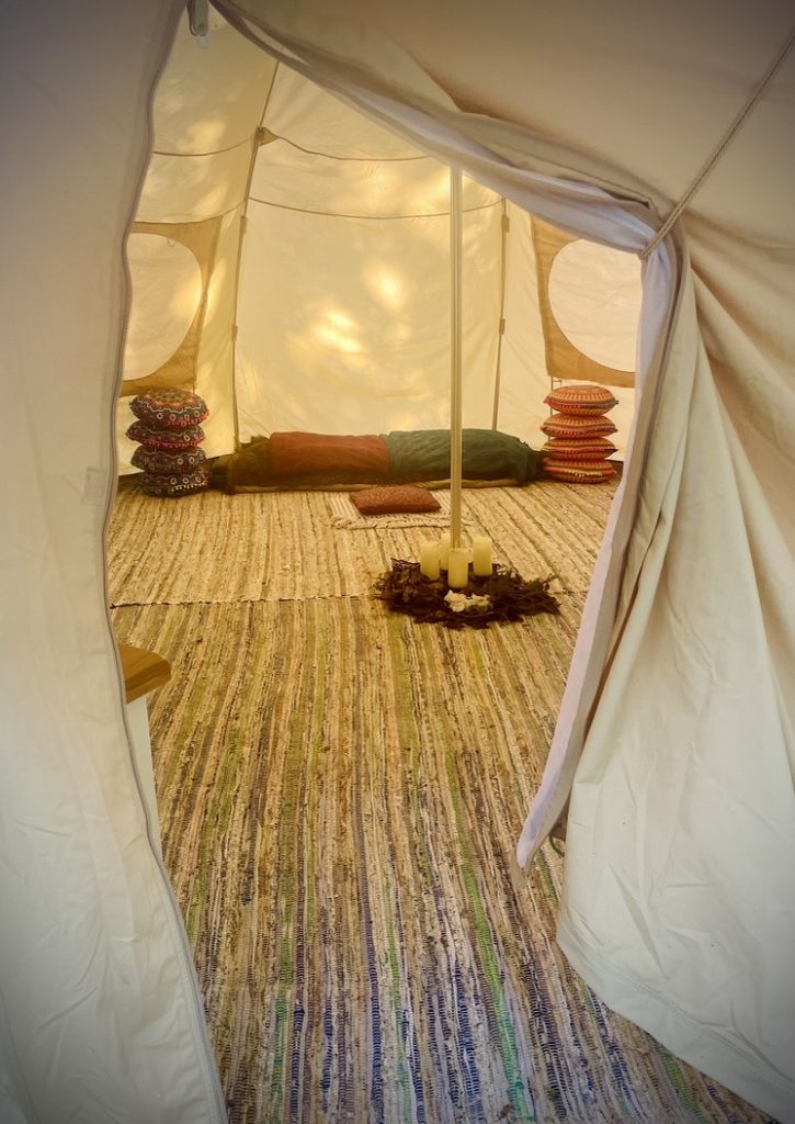 Inside, the floor is layered with rugs and insulating matting, the lighting kept soft, blankets and cushions always to hand. There is a heater for colder days. Bella is the kind of space that tells your nervous system it is safe to relax. In daylight, sunlight filters softly through the canvas walls. At night, candlelit and glowing, she becomes something else entirely. A beacon in the grove.